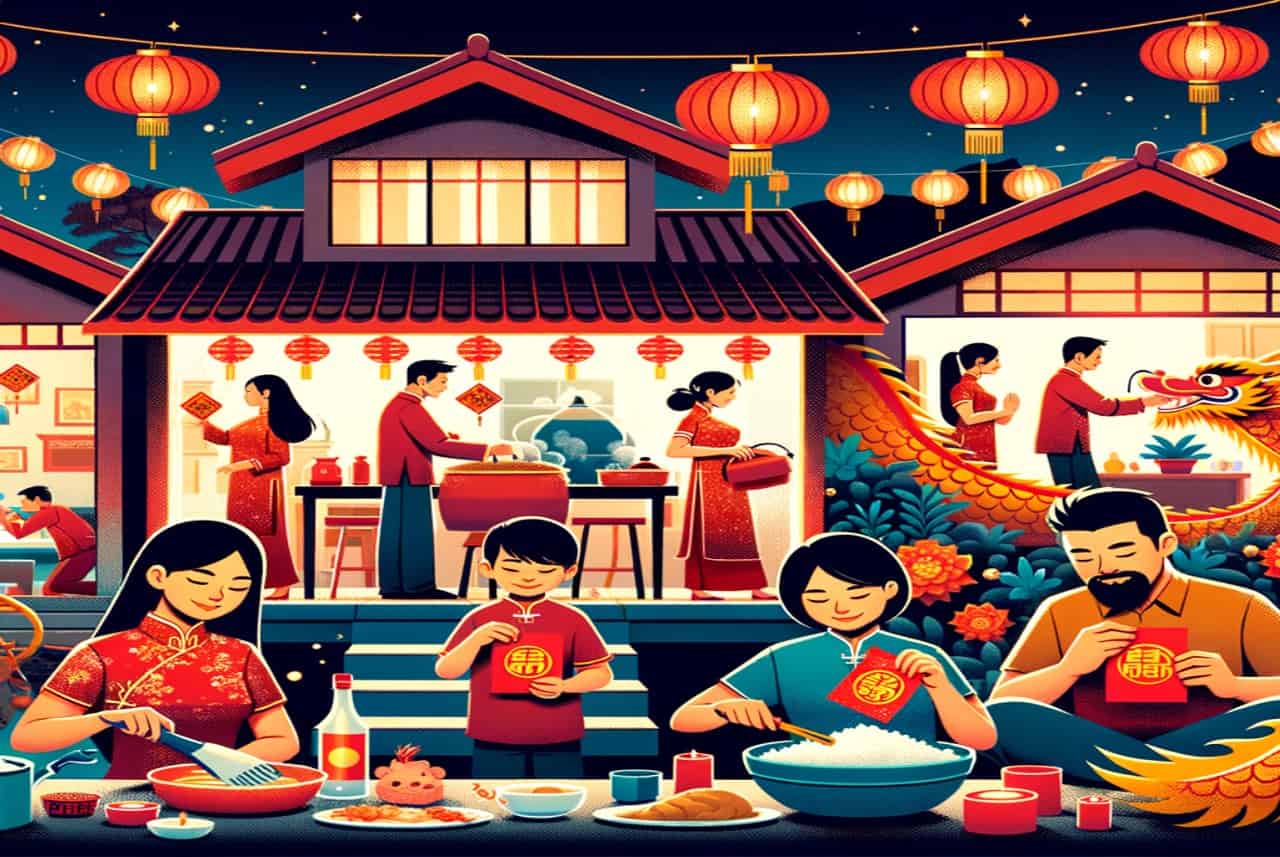 Un’importante usanza è il pranzo del giorno di Capodanno, dove le famiglie si riuniscono. I piatti serviti hanno significati speciali; ad esempio, il pesce simboleggia abbondanza e prosperità. Condividere un pasto con la famiglia è un modo per rafforzare legami e auspichere un nuovo anno ricco di affetto e armonia.
